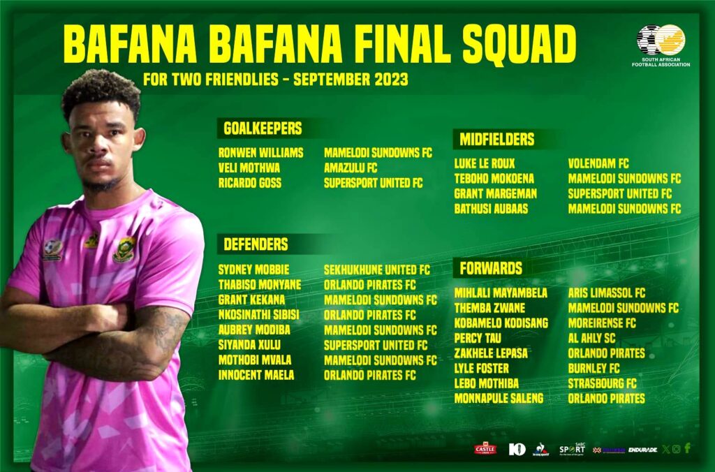 Forwards: Mihlali Mayambela (Aris Limassol, Cyprus), Themba Zwane (Mamelodi Sundowns), Kobamelo Kodisang (Moreirense, Portugal), Percy Tau (Al Ahly, Egypt), Zakhele Lepasa (Orlando Pirates), Lyle Foster (Burnley, England), Lebo Mothiba (RC Strasbourg, France), Monnapule Saleng (Orlando Pirates).