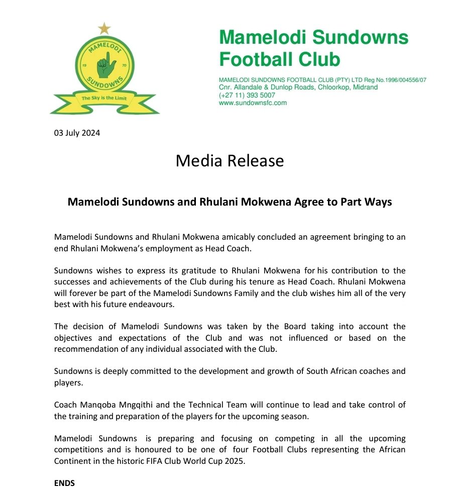 Ahead of the 2024/25 season, Mamelodi Sundowns have confirmed parting ways with head coach Rhulani Mokwena on Wednesday afternoon.