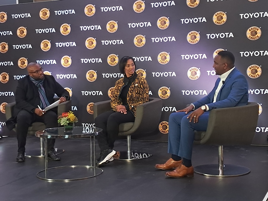 SuperSport presenter Thabiso Tema chats to Kaizer Chiefs Marketing and Commercial Director Jessica Motaung and Young Africans President Hersi Said ahead of the inaugural Toyota Cup between Kaizer Chiefs and Tanzania’s Young Africans at the Toyota Stadium in Bloemfontein on the 28th of July 2024.