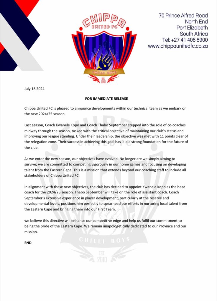 “Thabo September will take on the role of assistant coach. Coach September’s extensive experience in player development, particularly at the reserve and developmental levels, positions him perfectly to spearhead our efforts in nurturing local talent from the Eastern Cape and bringing them into our first team.