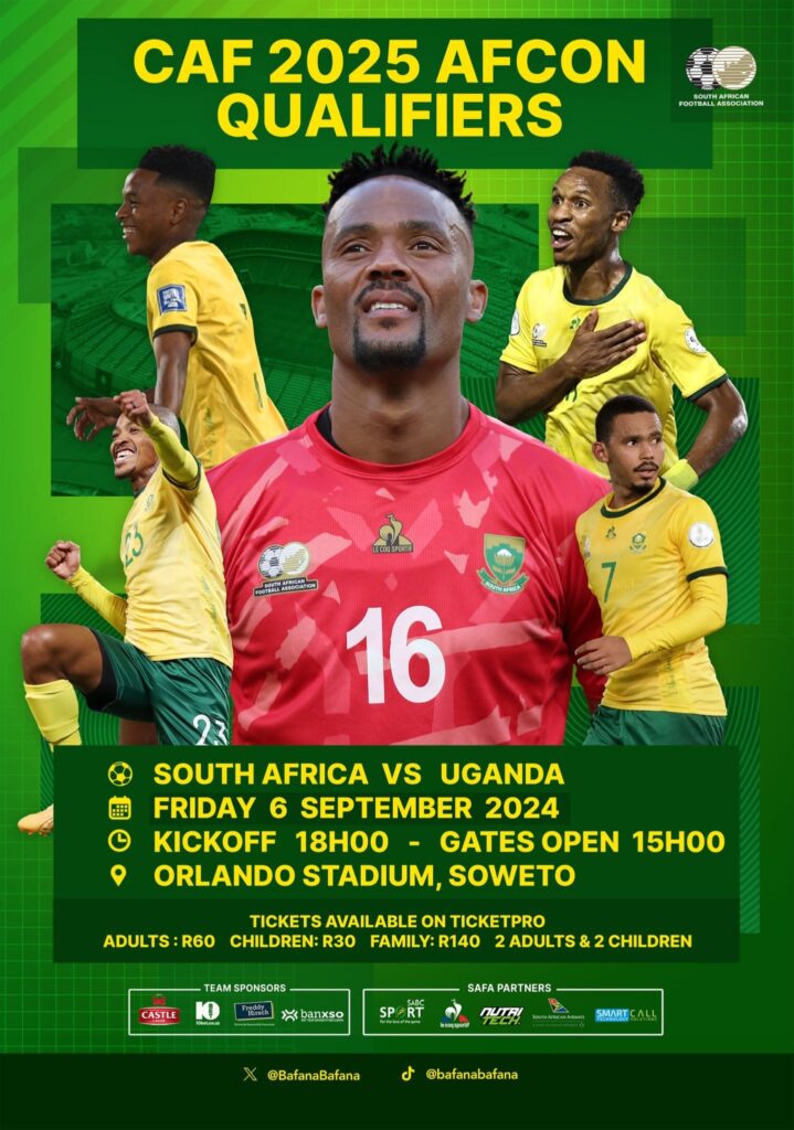 Bafana Bafana will welcome Uganda in a 2025 Africa Cup of Nations (AFCON) qualifier match on Friday, 6 September 2024 at Orlando Stadium in Soweto at 18h00, and the tickets are on sale.