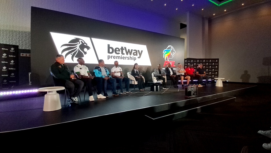 SuperSport presenter Thomas Mlambo and SABC presenter Vusiwe Ngcobo chat to the coaches of the eight teams (Stellenbosch FC, Golden Arrows, Richards Bay FC, TS Galaxy, Mamelodi Sundowns, SuperSport United, Sekhukhune United and Magesi FC) during the launch of the 2024/25 Betway Premiership in Sandton on Tuesday, 3 September 2024.