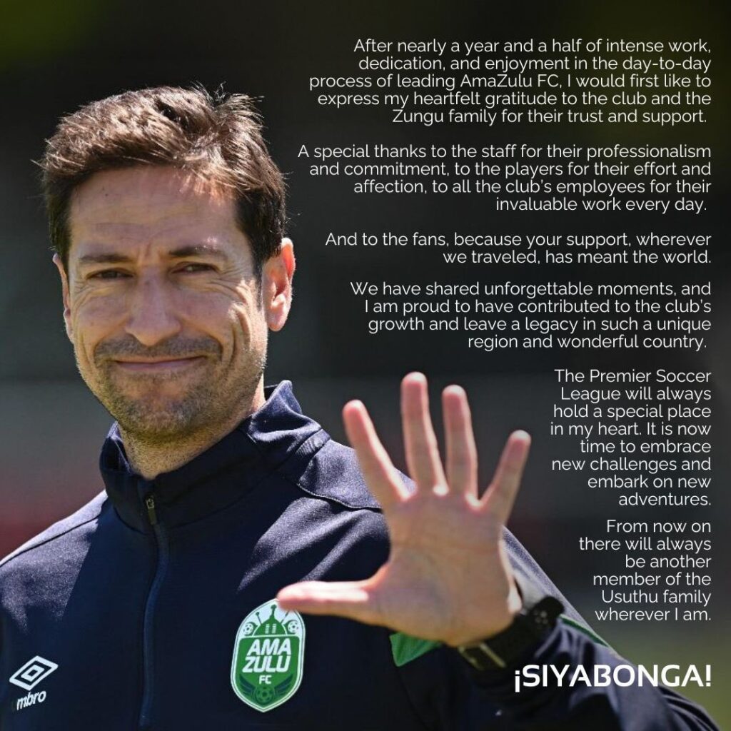Pablo Franco Martin has penned a farewell letter, following his release from AmaZulu FC on Sunday after the team’s poor start to the 2024/25 Betway Premiership season.
