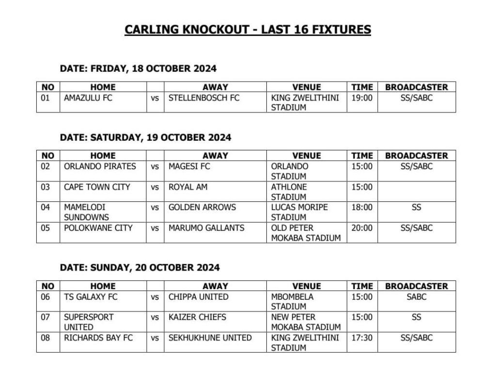 Following the exciting launch of the Carling Knockout and the Round of 16 draw held on Tuesday, the Premier Soccer League (PSL) has officially announced the dates, venues, and kick-off times for the Round of 16 fixtures.
