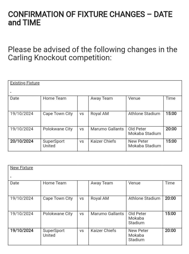 SuperSport United and Kaizer Chiefs were set to meet at New Peter Mokaba Stadium in Polokwane at 15h00 on Sunday, 20 October 2024, but the match has been moved to 20h00 on Saturday, 19 October 2024.