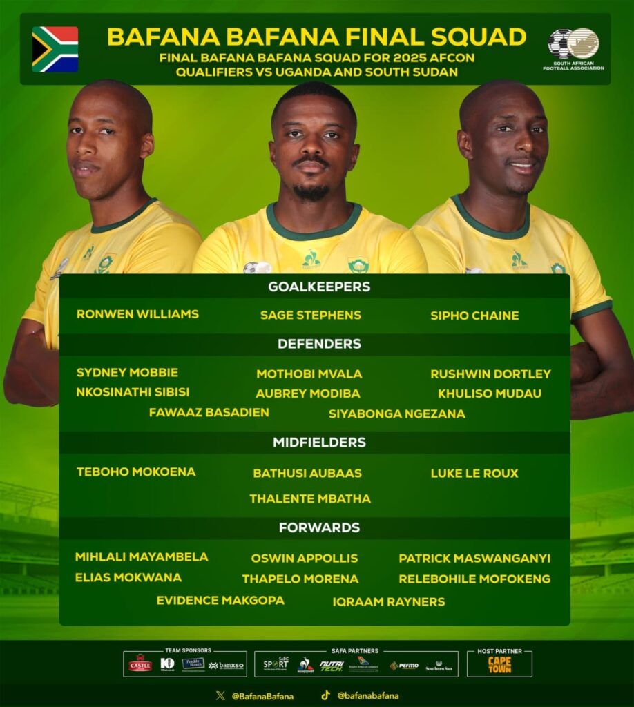 Bafana Bafana head coach Hugo Broos has announced his squad for the upcoming 2025 Africa Cup of Nations qualifiers against Uganda and South Sudan.
