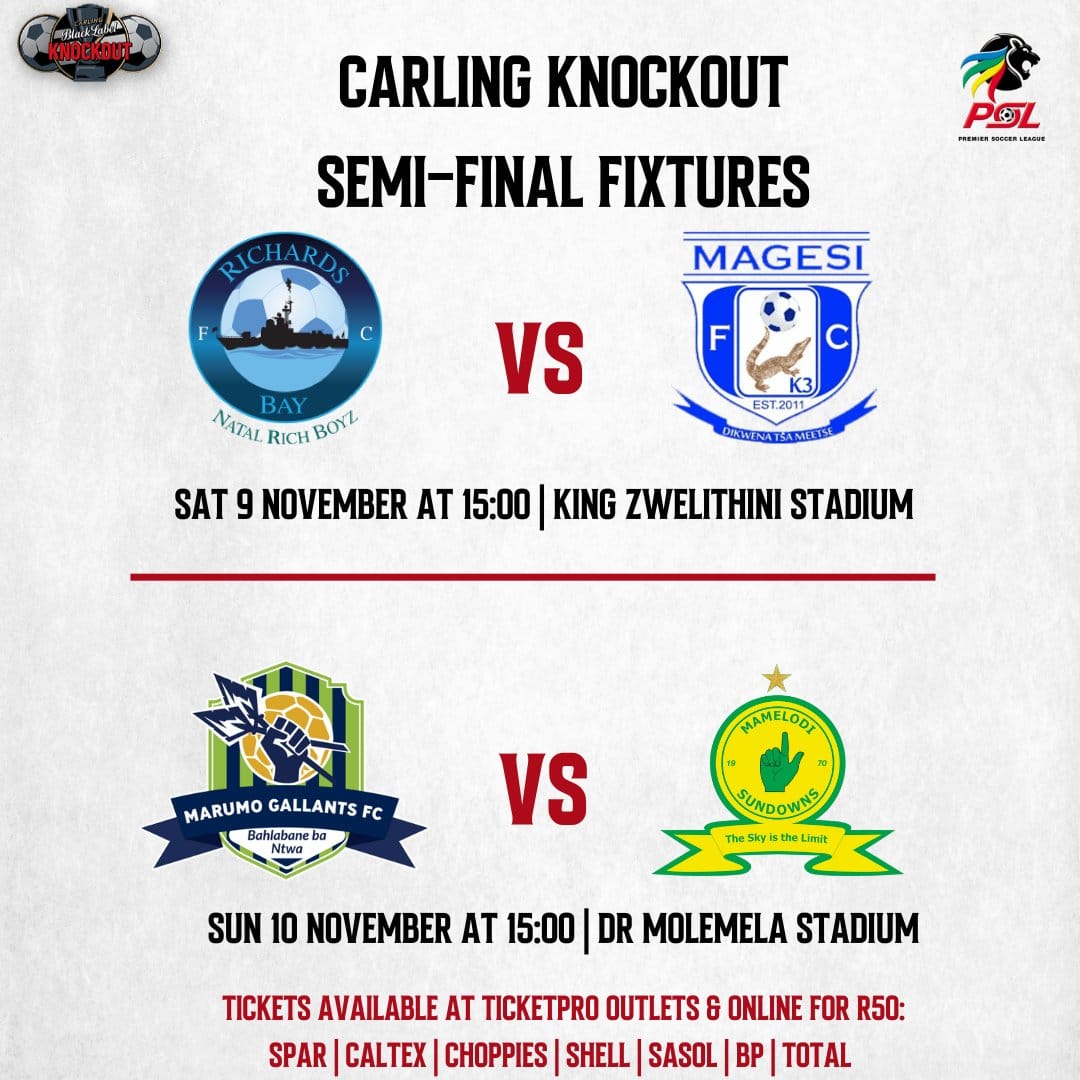 Tickets for the Carling Knockout semi-final matches between Richards Bay FC and Magesi FC as well as Marumo Gallants and Mamelodi Sundowns are still available.