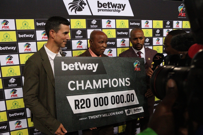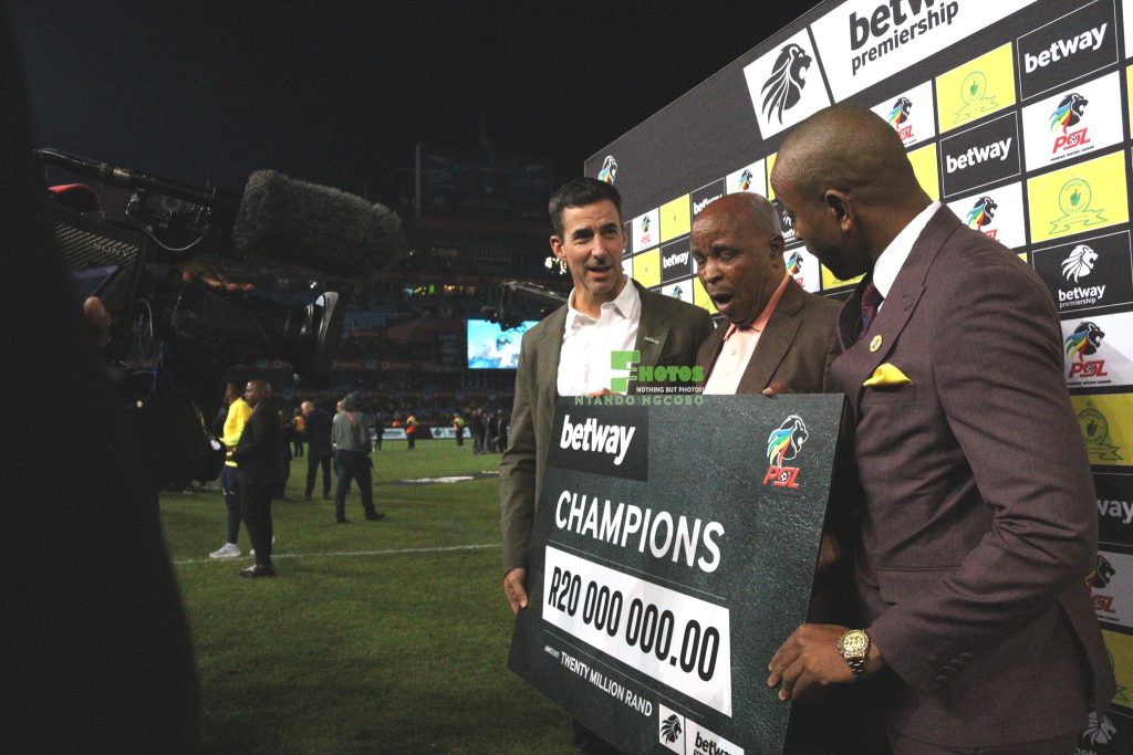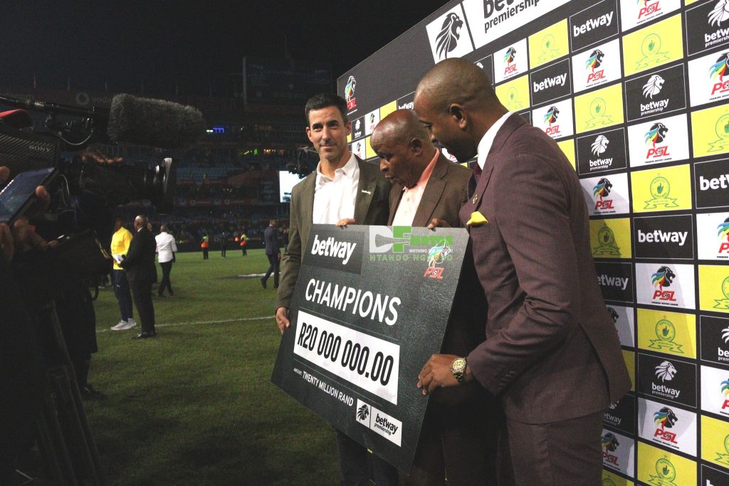 Mamelodi Sundowns received R20-million as first Betway Premiership Champions from Betway South Africa’s Head of Marketing, Mark Rowles at Loftus Versfeld Stadium in Pretoria on Sunday, 18 May 2025.