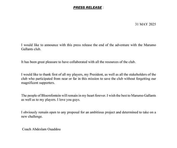 Abdeslam Ouaddou has officially stepped down as head coach of Marumo Gallants ahead of the 2025/26 season.