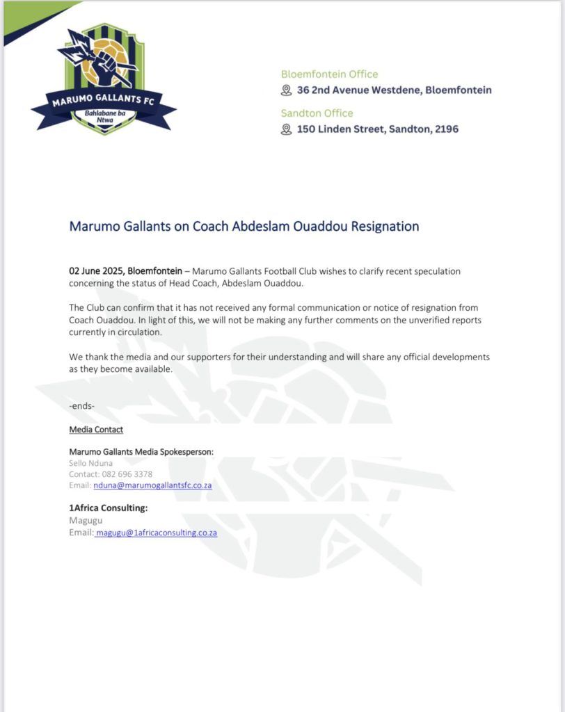 Marumo Gallants Football Club wishes to clarify recent speculation concerning the status of Head Coach, Abdeslam Ouaddou.