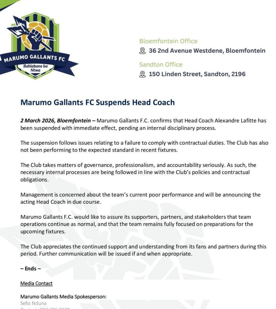 Marumo Gallants have officially announced the immediate suspension of head coach Alexandre Lafitte on Monday, 2 March 2026.